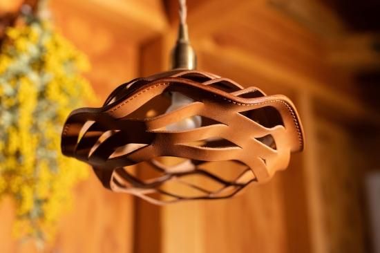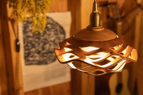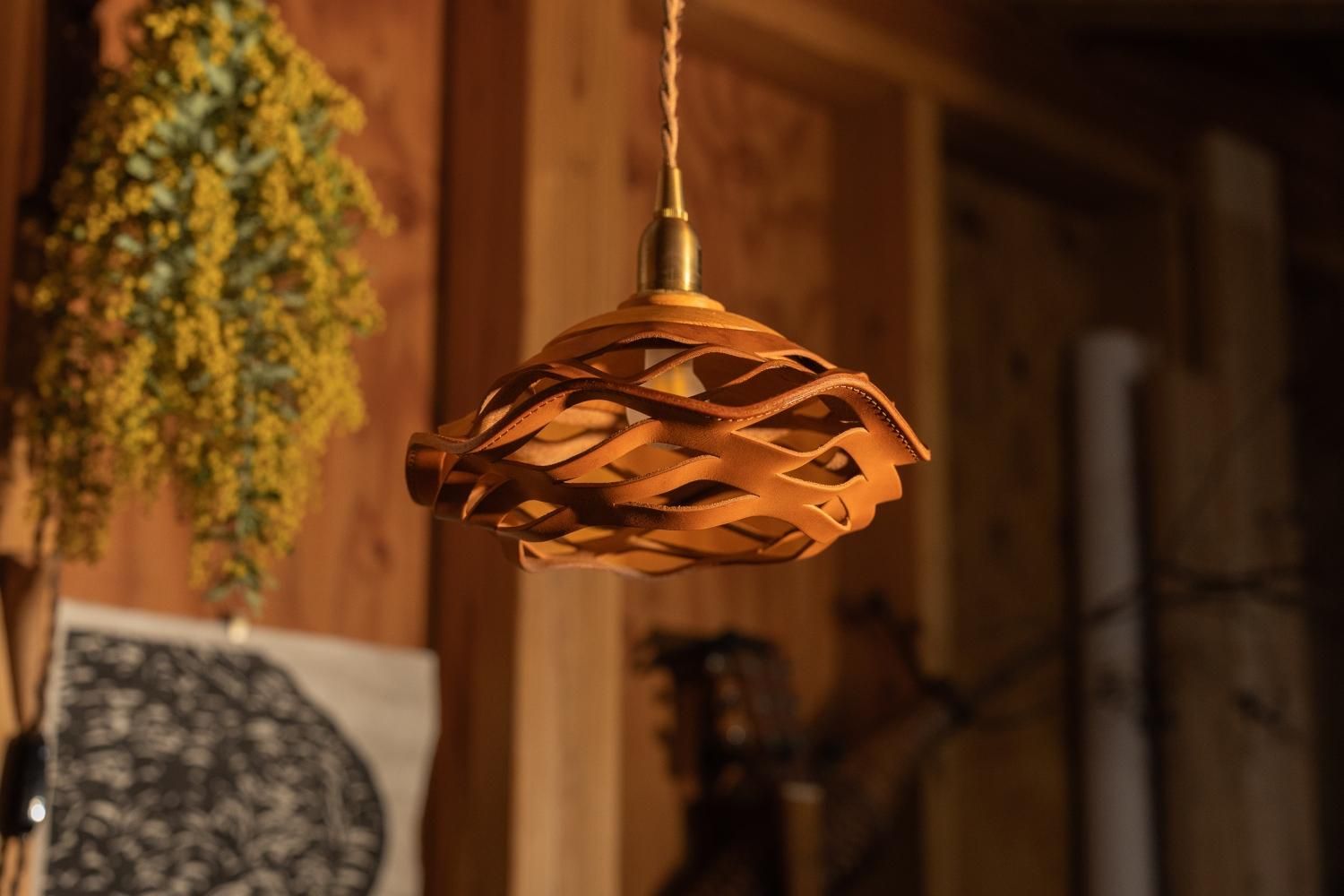 「HANUI LEATHER(ハヌイレザー)」のランプシェード大サイズとなります。2枚の円形の革に切り込みを入れ、水を使いふんわりと膨らませたランプシェード。木材のベースとの相性も良く、波紋状のスリットから漏れる光が空間を温かく演出してくれます。